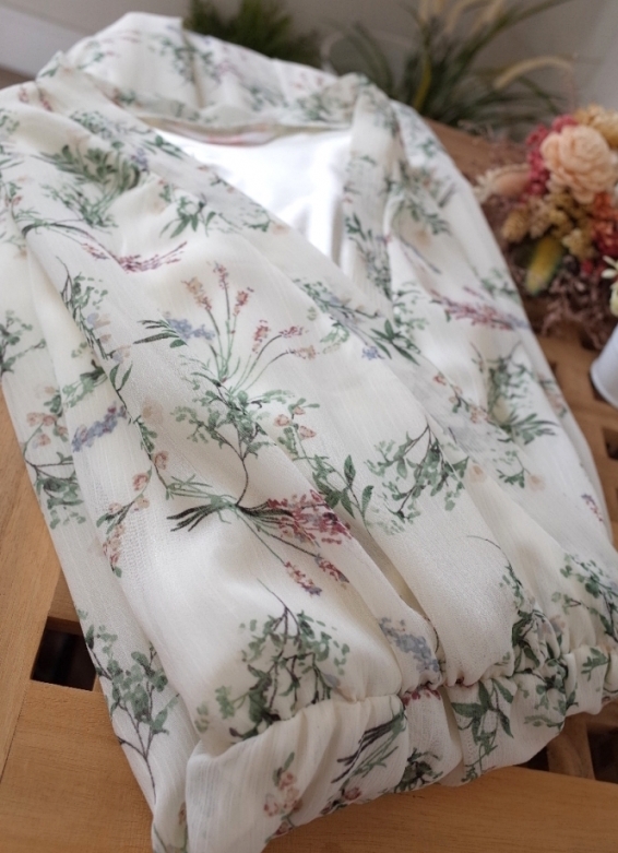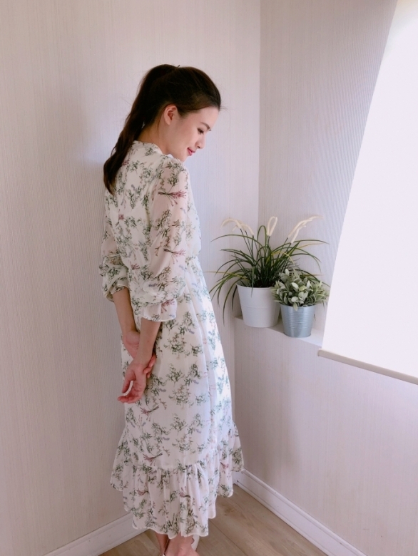 正韓 極美 淡雅花卉雪紡腰身長洋