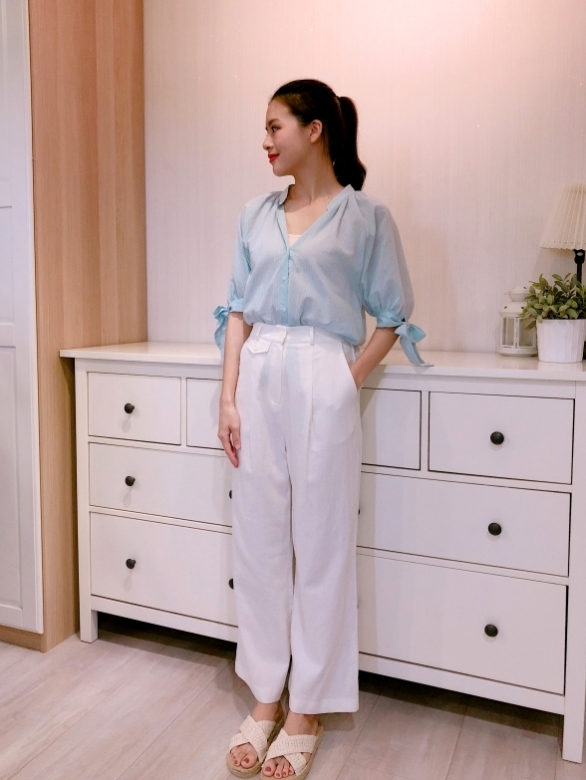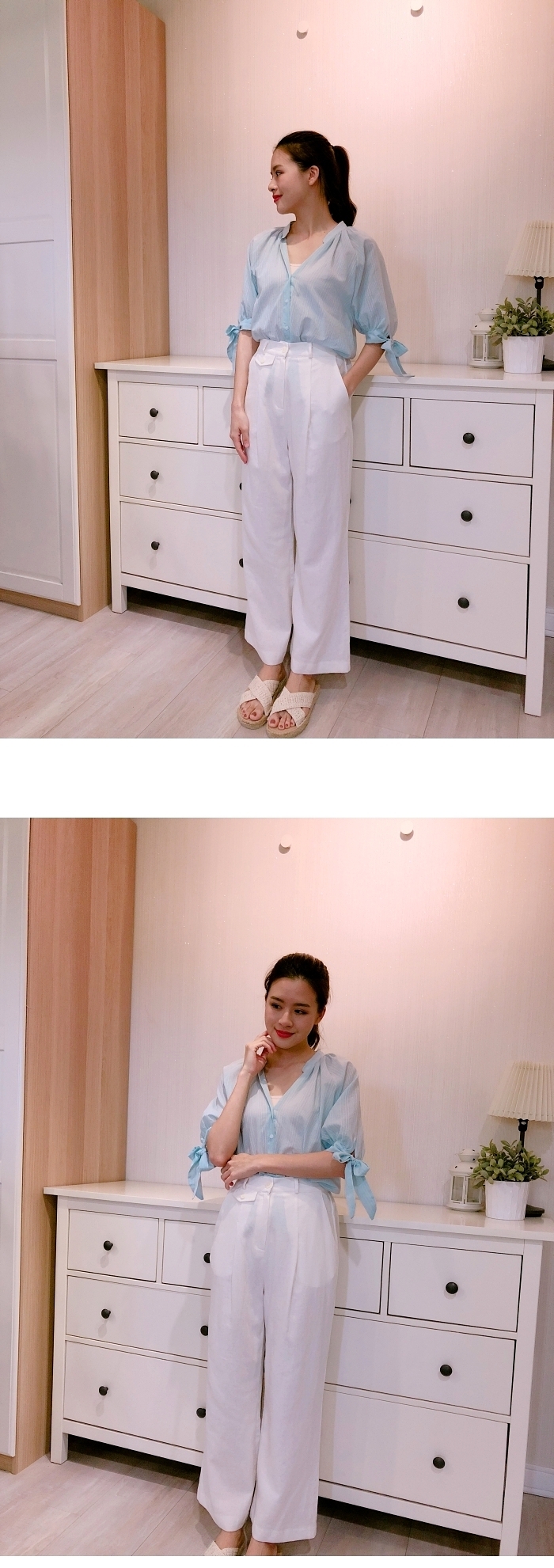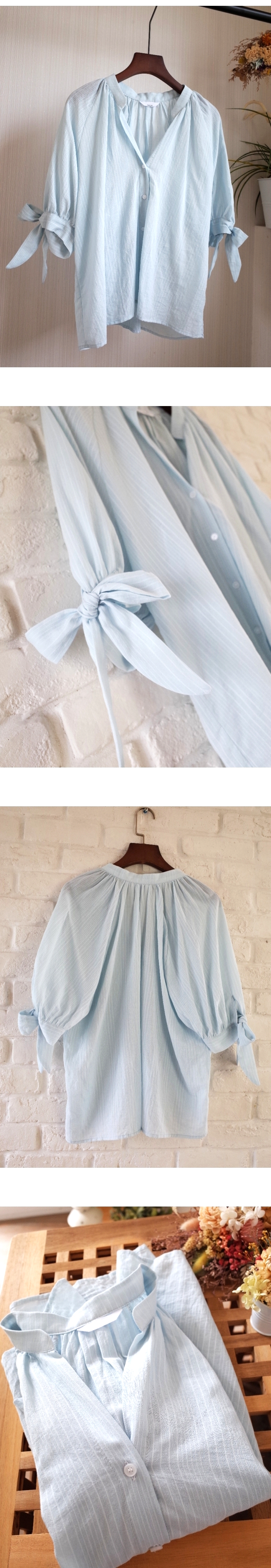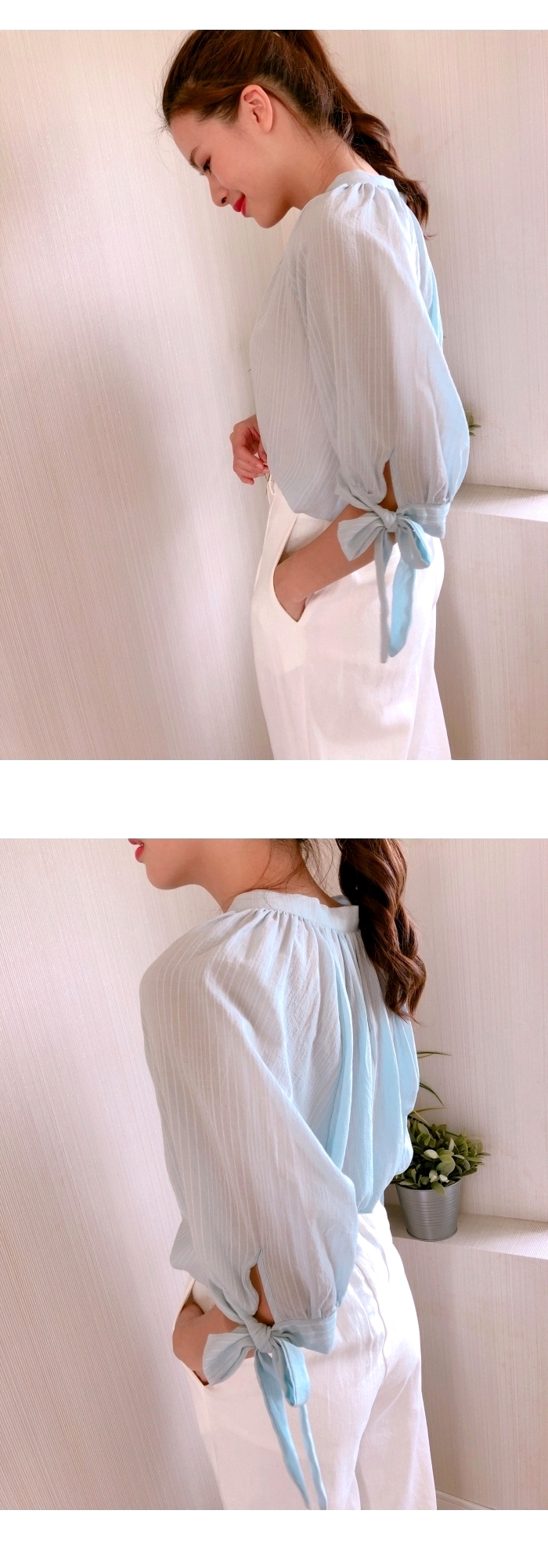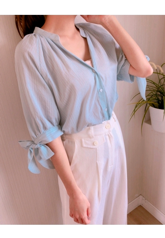 正韓 版型超正 知性氣質直條V領蝴蝶結袖上衣