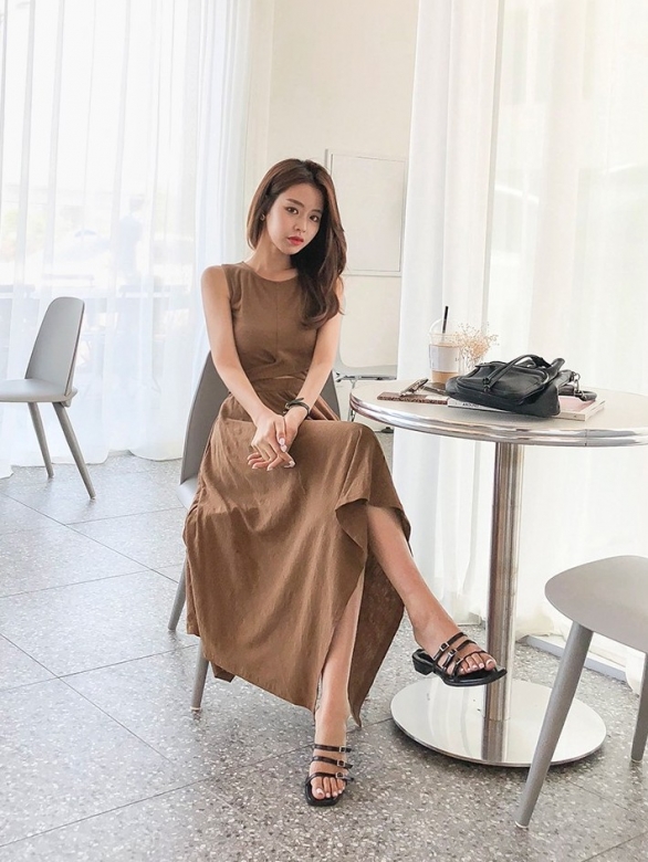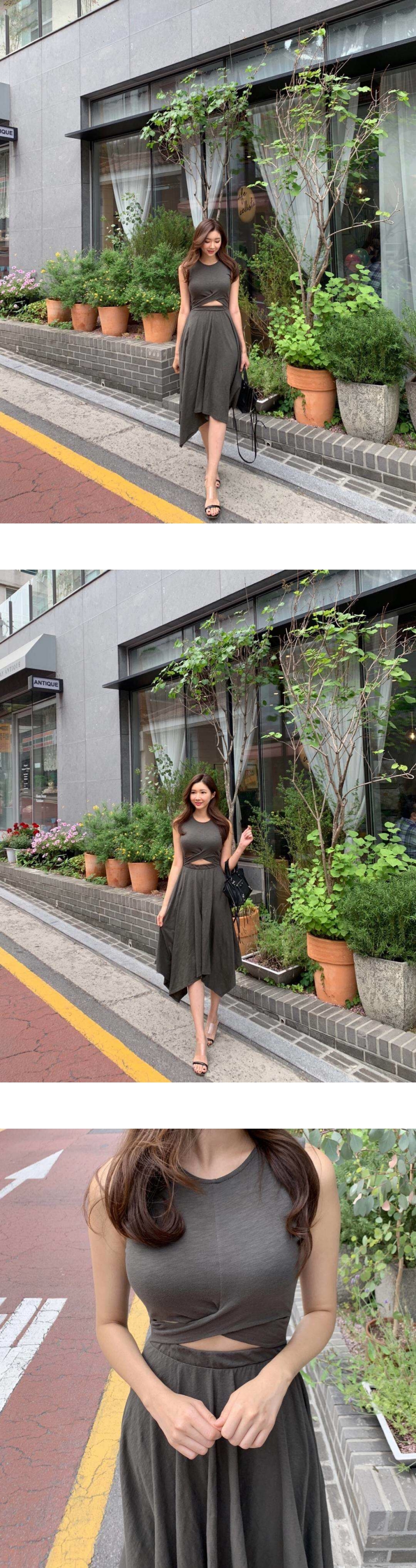 正韓 激瘦自留 竹節棉交叉簍空高腰無袖長洋