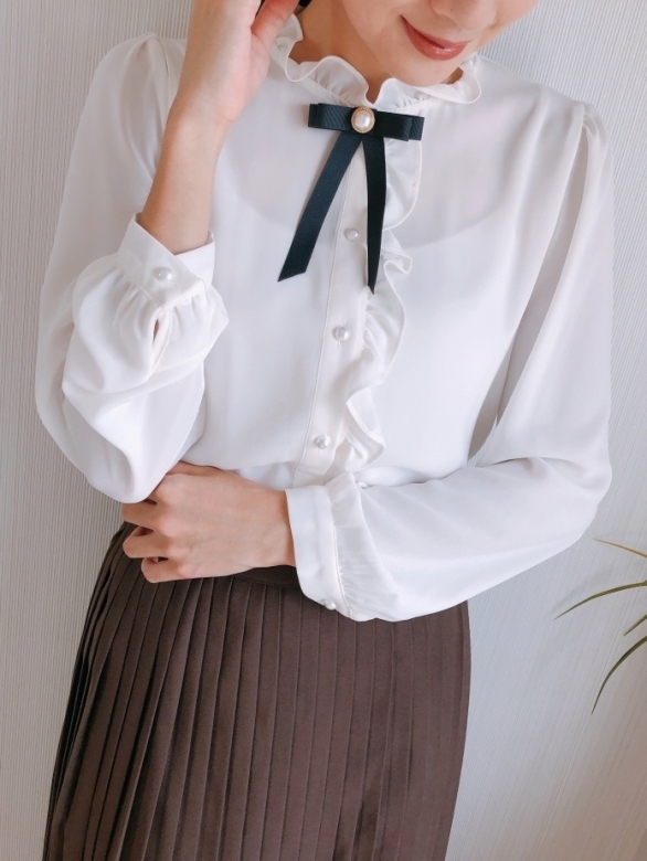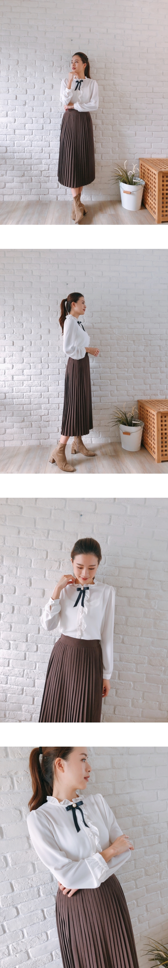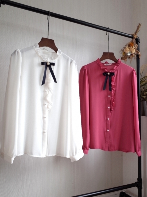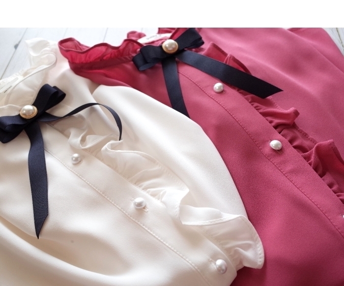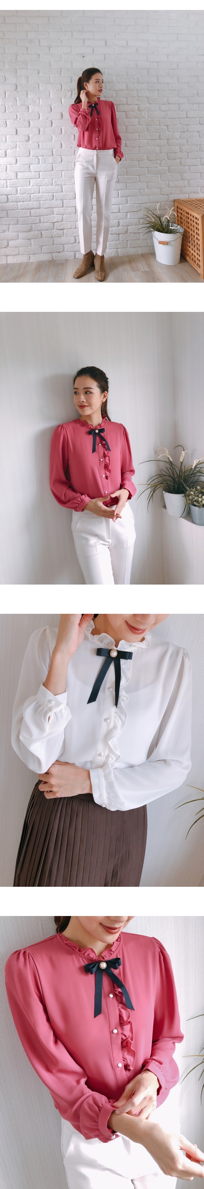 特價 限量白1 正韓 小荷葉邊蝴蝶結珍珠扣雪紡上衣(蝴蝶結可拆)